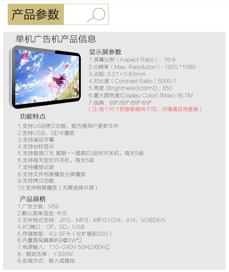 - 全面支持:各種常規(guī)音視頻和圖片格式,支持1920*1080高清淅顯示。