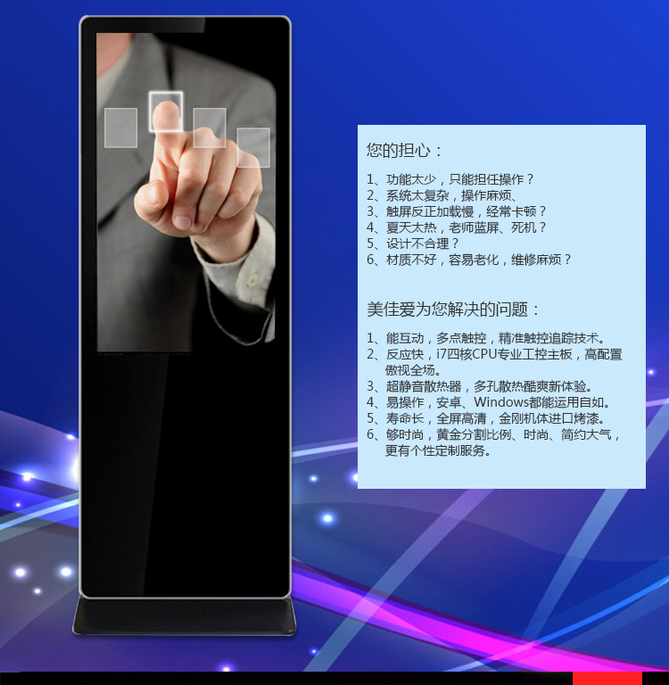 【深圳市美佳愛-液晶廣告機,觸摸顯示器生產(chǎn)廠家電話400-997-9971】43寸紅外觸摸一體機,觸控顯示器通過ISO9001_3C認證,主營多點紅外/電容式觸摸屏一體機,觸控查詢一體機,其他尺寸18.5寸21寸24寸27寸32寸40寸43寸46寸49寸55寸65寸75寸86寸98寸100寸多功能多媒體教學會議一體機,戶外立式/壁掛雙面廣告機,單機版/安卓網(wǎng)絡廣告機 豎屏樓宇電梯廣告機,長條型屏,工業(yè)級工控電腦觸摸顯示器,大尺寸觸摸屏查詢系統(tǒng),商顯平板電腦電視,提供報價價格,安裝施工,售后維修等